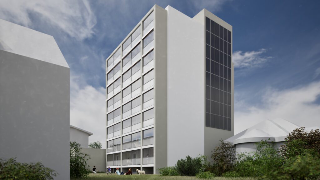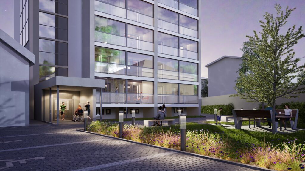 Bytový dům v Rožnově pod Radhoštěm je přestavbou bývalého internátu na moderní bydlení. Projekt zahrnuje nejen úpravu samotného objektu, ale také okolí – nové parkoviště, odpočinkovou zahradu a prostor pro odpad. Stavba dostane novou fasádu v bílo-šedých odstínech, rozšířené lodžie s ocelovou konstrukcí a velká francouzská okna, která zajistí více denního světla. Součástí návrhu je také nové vstupní řešení s přístřeškem, které podtrhne moderní charakter domu.