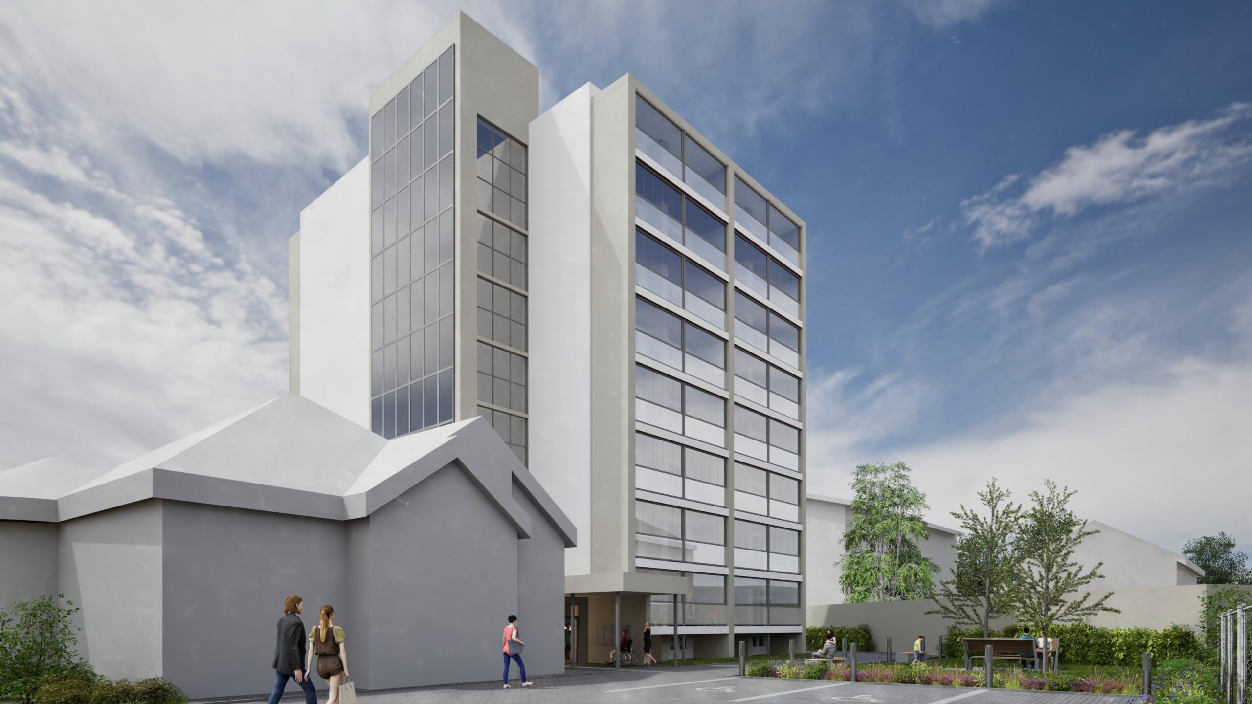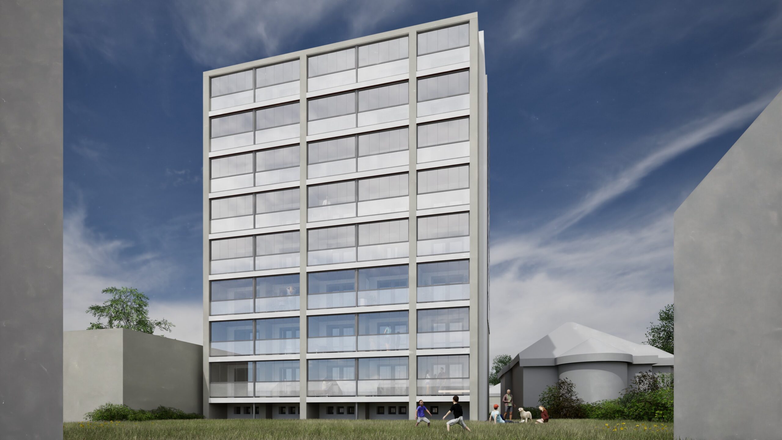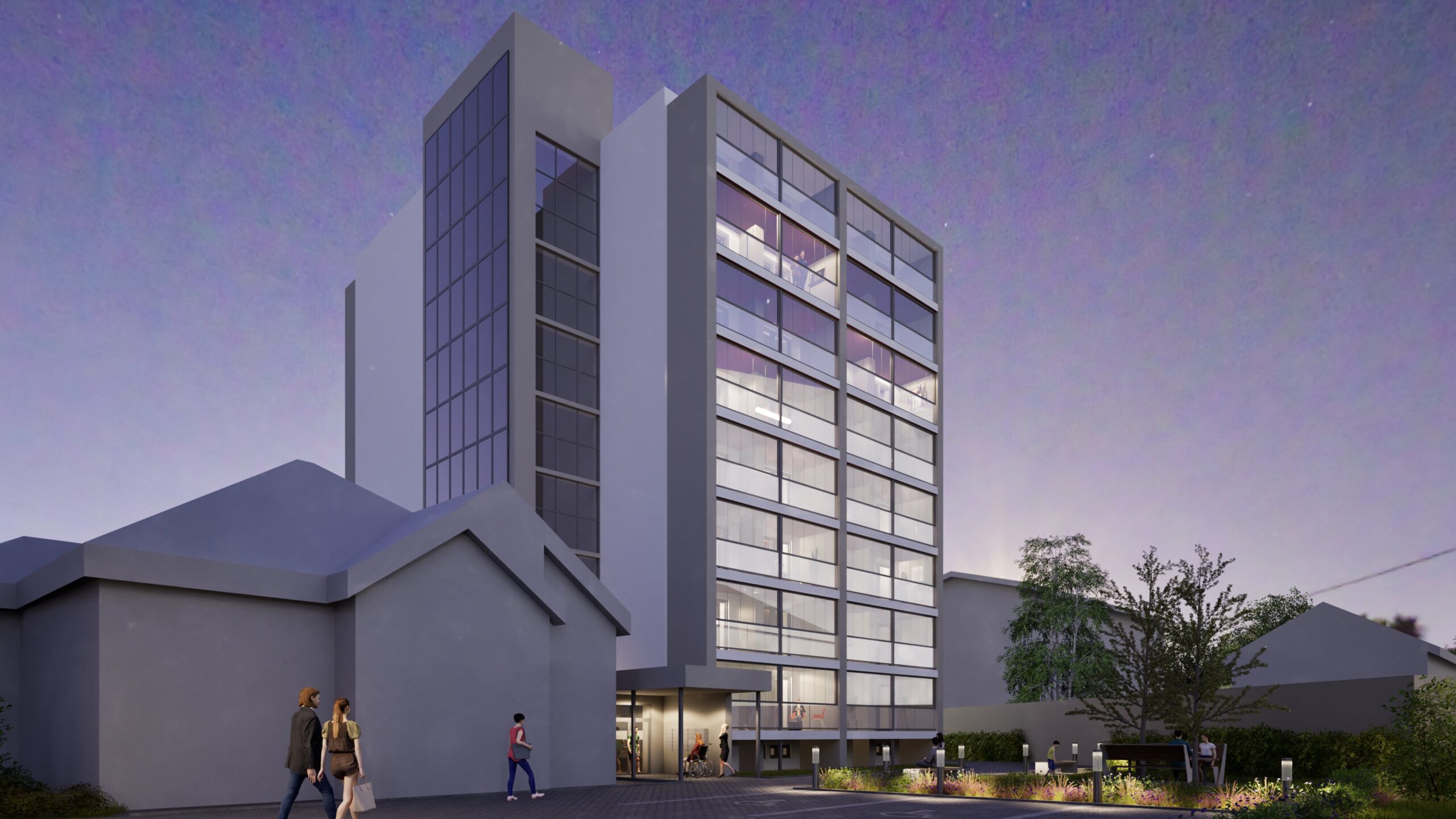 Bytový dům v Rožnově pod Radhoštěm je přestavbou bývalého internátu na moderní bydlení. Projekt zahrnuje nejen úpravu samotného objektu, ale také okolí – nové parkoviště, odpočinkovou zahradu a prostor pro odpad. Stavba dostane novou fasádu v bílo-šedých odstínech, rozšířené lodžie s ocelovou konstrukcí a velká francouzská okna, která zajistí více denního světla. Součástí návrhu je také nové vstupní řešení s přístřeškem, které podtrhne moderní charakter domu.